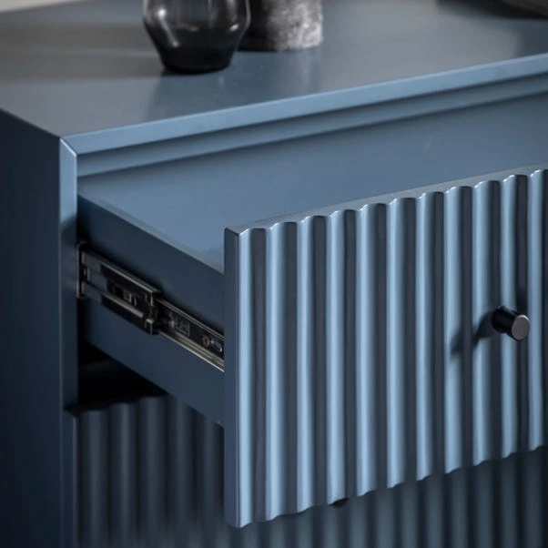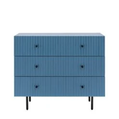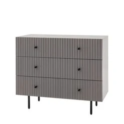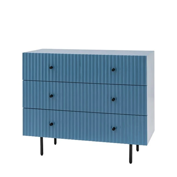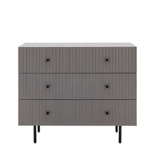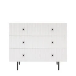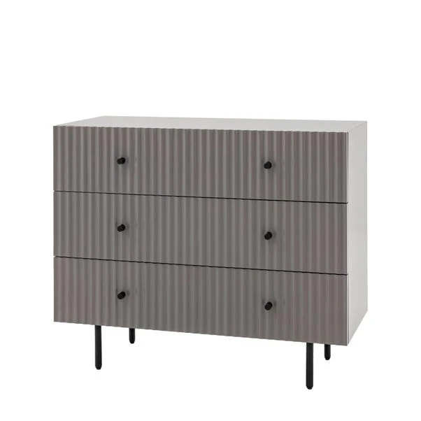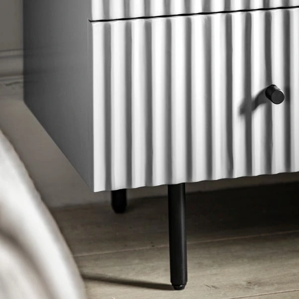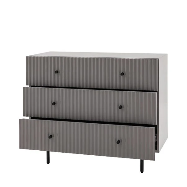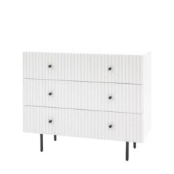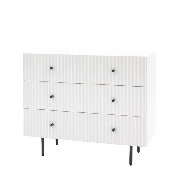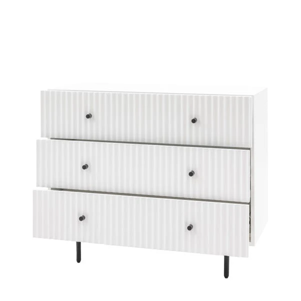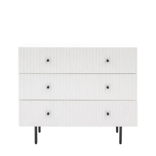 Boasting stylish drawer fronts with a vertical scalloped design, this chest of drawers adds a touch of sophistication to any space. The white painted finish exudes timeless elegance, while black metal legs and handles complete the contemporary look. Perfect for any modern apartment interior, this chest of drawers offers both style and practicality.