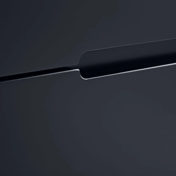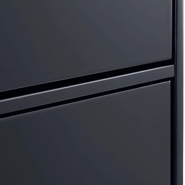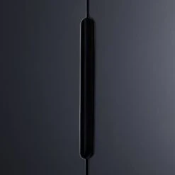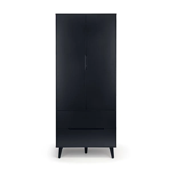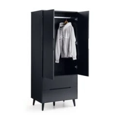 This double wardrobe offers a retro-inspired design with modern storage solutions. Featuring two drawers in a matt anthracite lacquered finish, it provides ample space for your clothing and accessories. The tapered oak finish legs and recessed handles add an elegant touch, while the sleek Scandinavian design complements any decor.