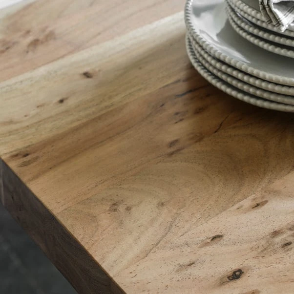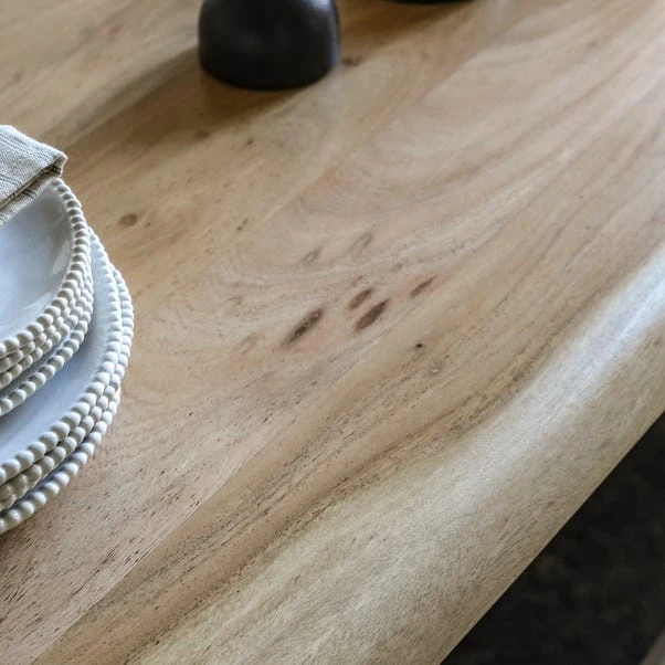 Paired with a black metal ‘U’ shaped underframe, this table exudes a modern semi-industrial look, ideal for eclectic interiors. Perfectly complemented by the matching dining bench, it’s available in two sizes to accommodate up to 6 or 8 guests comfortably, making it perfect for family gatherings and dinner parties.