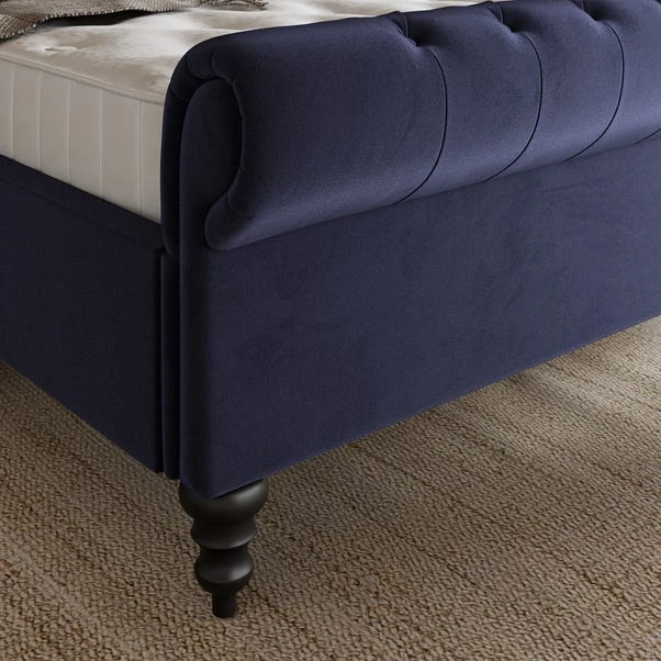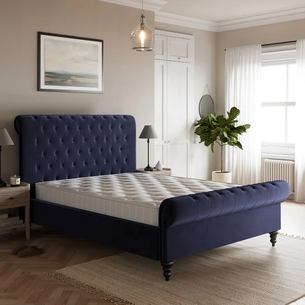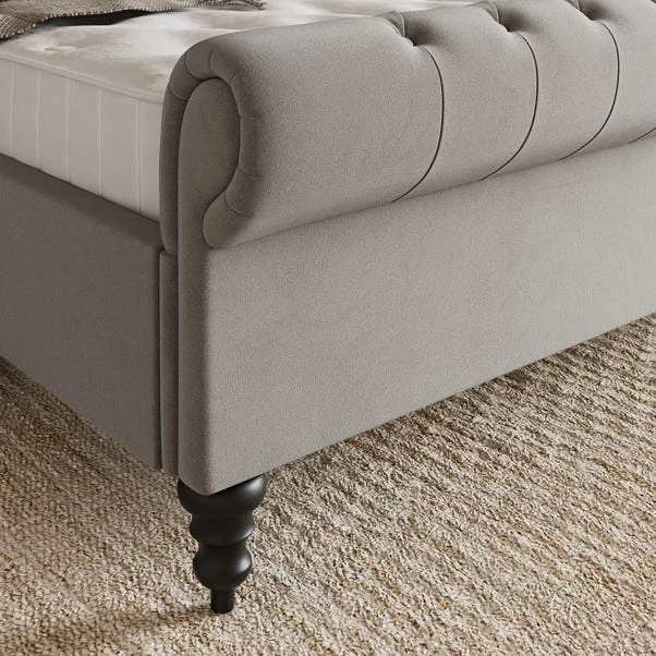 Relax in style with this elegant Chesterfield bed, designed to elevate your bedroom to new levels of sophistication and opulence. With its striking design and attention to detail, this bed effortlessly adds a touch of class to any space. The Chesterfield style has long been revered for its timeless appeal and enduring charm, and our bed frame stays true to that tradition. The elegantly scrolled head and footboards are adorned with deep buttoning details that give this bed a timeless feel. The padded headboard offers extra support, allowing you to lean back and unwind in utmost comfort. Sink into the plush upholstery and feel the cares of the day melt away as you indulge in the luxurious embrace of this remarkable bed frame. Available in a beautiful range of colours, you can choose the perfect hue to complement your bedroom decor. From classic neutrals to bold statement shades, our Chesterfield Bed ensures that there’s an option to suit every taste and style.