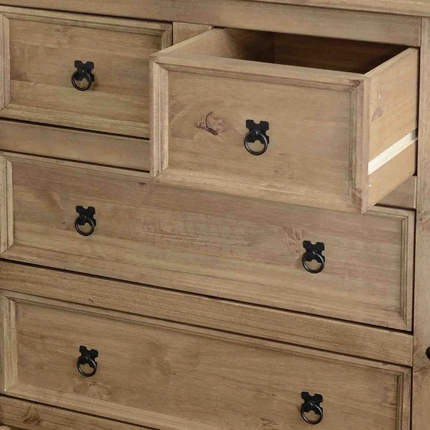 The Seconique Corona 3 Plus 2 Drawer Chest boasts ample storage for your bedroom. This beautiful distressed waxed pine chest will bring a whole new look to your home. The attractive design with metal drop handles and the rich colour of the wood make it a superb piece of furniture to look at that is also highly functional. With five spacious drawers, there’s plenty of room to store your belongings. Installation Note: This product should be fixed to a wall using a wall fastener