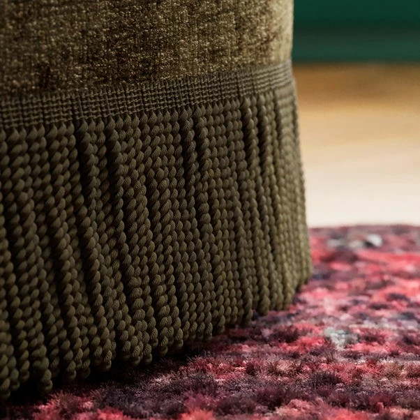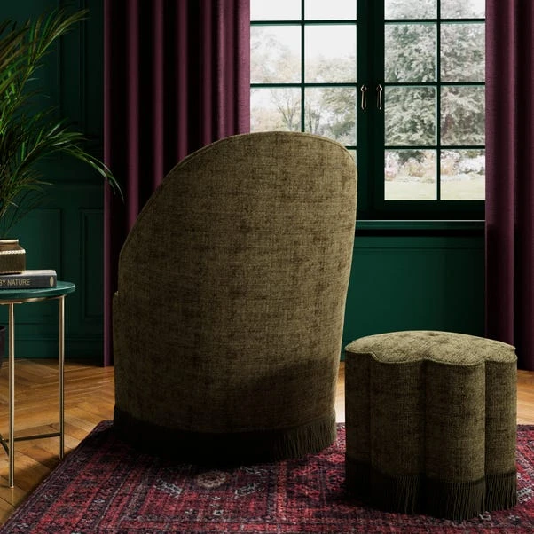 Crafted in distressed chenille for a soft, textured look, this chair features elegantly curved arms that enhance its sophisticated silhouette. The tassel detailing adds a unique and decorative touch, making it a true statement piece.