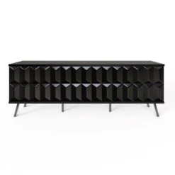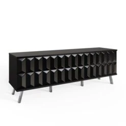 Featuring push to open doors with internal shelving to store away all your bits and bobs, this deep textured contemporary table has a high-gloss painted finish with unique smoked chrome legs.