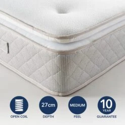 Indulge in unparalleled luxury with the Fogarty Memory Foam Pillow Top Open Coil Mattress. Featuring a 13.5g open coil Bonell spring and a recycled polyester fillings, it combines support with thoughtful design. The memory pillow-top layer moulds to your body, providing an extra layer of comfort, while the handles and vents allow for easy rotation and flipping. With a wire frame for added support, hand-tufted detailing, and a soft viscose panel fabric, this mattress offers a medium firmness that’s pure bliss.