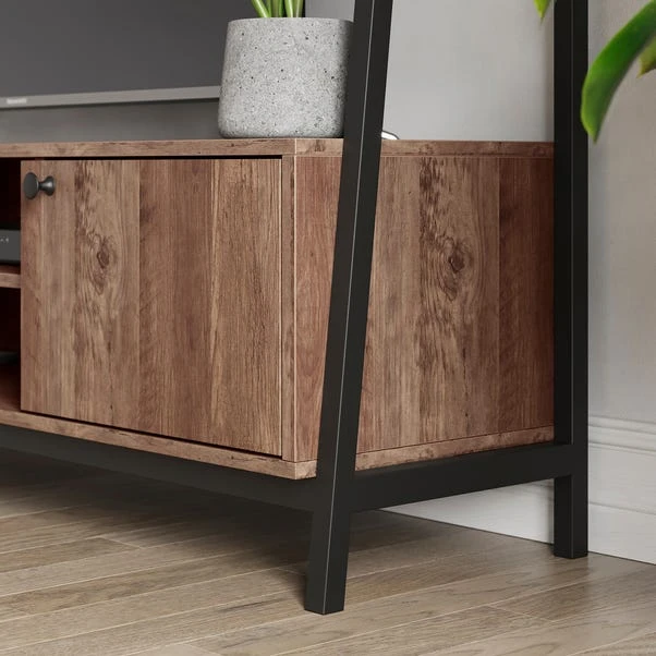 Inspired by contemporary and simplistic styling the Fulton range is a perfect statement piece to any living space. Made from durable materials with a metal tube base and unique matt finish, this self-assembly range features a rustic pine-effect finish with complementing black handles.
