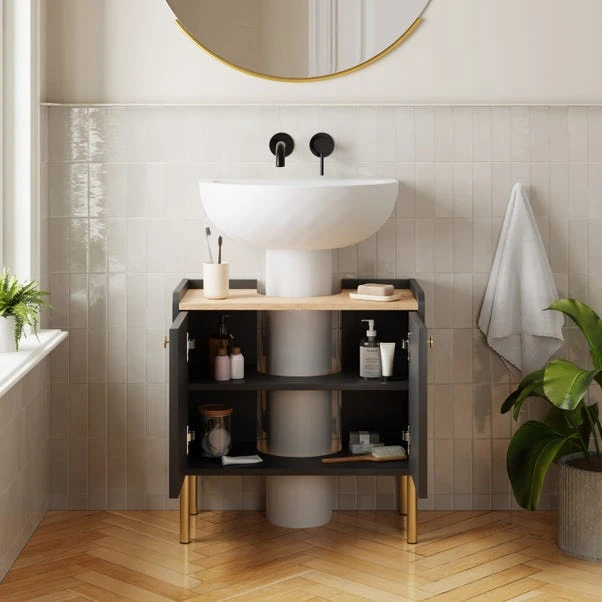 Maximise your bathroom storage with this stylish under-sink unit, designed to make the most of every inch of space. Featuring a sleek, contemporary design, it neatly fits around your basin, providing a smart solution for organising toiletries, cleaning essentials, and everyday bathroom items. The smooth cabinet doors keep clutter out of sight while allowing for easy access when needed.
