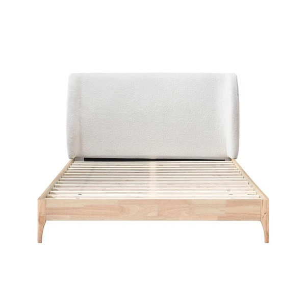 This piece that exudes grandeur and contemporary charm. This bed frame seamlessly blends soft Bouclé upholstery with a sturdy wooden frame, creating a modern classic. The winged headboard and curved feet add a touch of sophistication, making it a statement piece in any modern bedroom setting.
