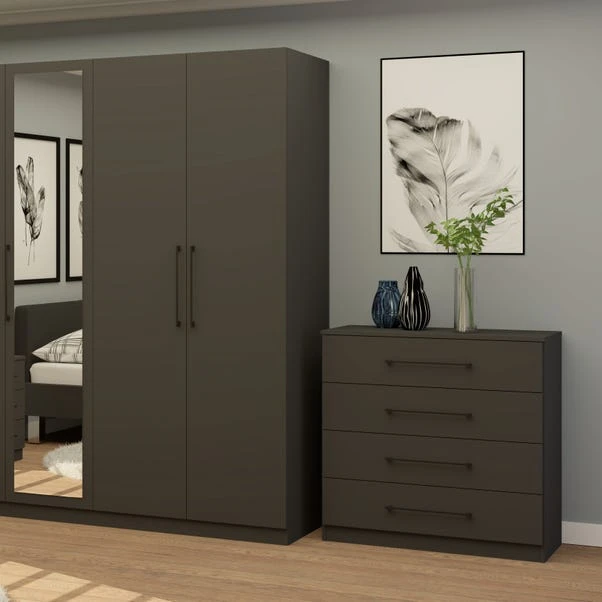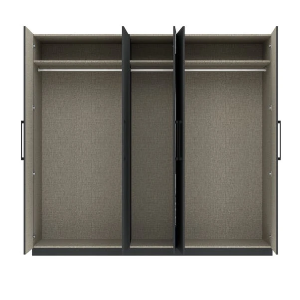 Spacious storage and contemporary style – the Foster 5 door wardrobe is an extra-large storage solution that doesn’t compromise on looks. With adjustable shelves and hanging rails, the space can be adapted to suit your needs. Modern, effortless style is achieved with sleek metal bar handles and a choice of oak effect or dark grey anthracite finishes and options for no mirrors/mirrored doors. The ideal storage companion for modern life.