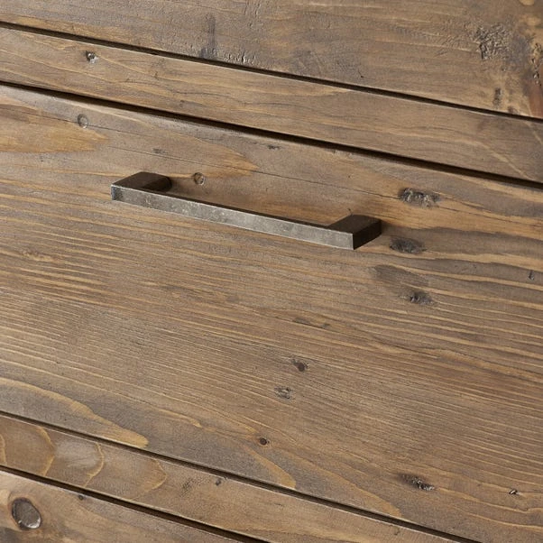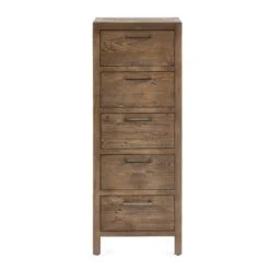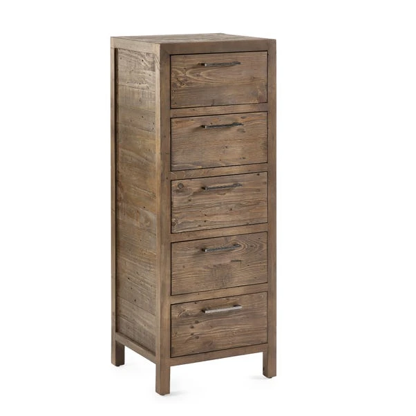 This tallboy, crafted from reclaimed and recycled wood, stands out with its unique design. The distressed finish and industrial-style metal handles add a rustic charm to your bedroom decor. With five spacious drawers, it offers ample storage space for clothing and other essentials.