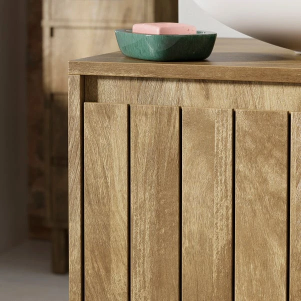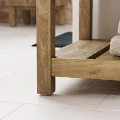 Designed for larger spaces, this unit accommodates two basins, making it ideal for busy households. The internal shelving provides generous storage for toiletries, while the bottom slatted shelf offers convenient space for towels or baskets. With its elegant mango wood effect finish, this vanity unit combines practicality with timeless charm, making it a standout feature in any bathroom.