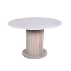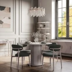Elegant yet inviting, the Cleo Round Dining Table is designed for those who appreciate fine craftsmanship and modern aesthetics. Its smooth marble top is perfectly balanced by a striking slatted wood base, creating a sculptural foundation that draws the eye. Paired with four upholstered dining chairs, this set is ideal for intimate meals, casual brunches, or lively dinner conversations.