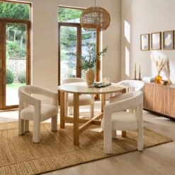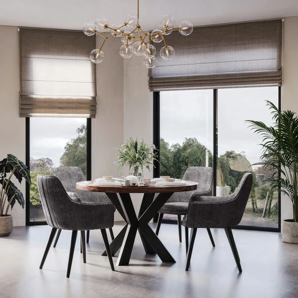The Logan round dining set offers a relaxed and practical setup for everyday living. Featuring a natural sheesham wood top, the table brings warmth and texture to your space, paired with sleek black metal legs for a modern contrast. Designed to comfortably seat four, it’s an ideal size for casual dinners or catching up over coffee. The set includes four Logan chairs, each upholstered in soft tan fabric that adds comfort without overwhelming the room.