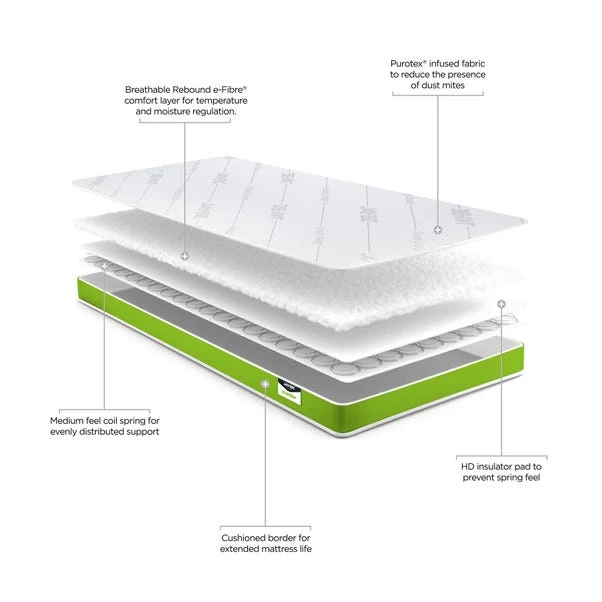 Complete with breathable rebound e-Fibre™ comfort layer to help regulate the temperature and allow a constant flow of air, this mattress is finished with edge-to-edge layers of comfort, reducing the chances of the mattress sinking or bulging.