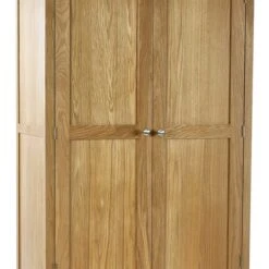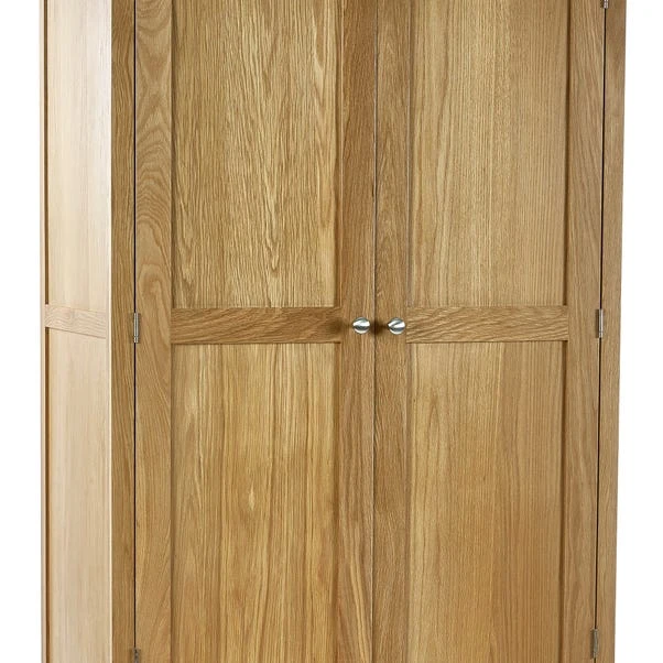 Crafted from solid oak and oak veneers, this wardrobe features a spacious double-door design and an additional drawer for extra storage. The round silver knobs add a touch of elegance to the piece, while its sturdy construction ensures it will last for years. This wardrobe offers ample space for clothing and accessories, making it a practical and attractive addition to any bedroom.