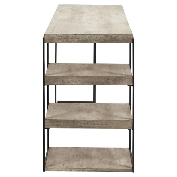 This desk’s concrete-effect wood tabletop offers a contemporary and robust surface, perfectly complemented by the sleek black iron legs that contribute to the desk’s modern industrial aesthetic. With three integrated shelves, this desk goes beyond mere functionality, providing additional space for storing books, documents, or displaying decorative items.
