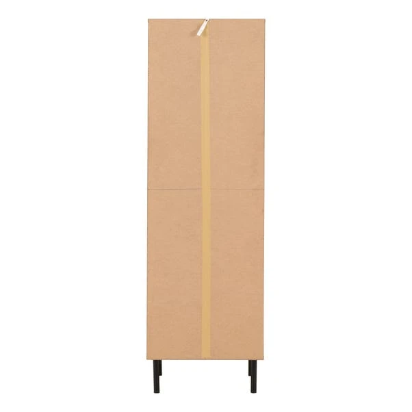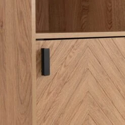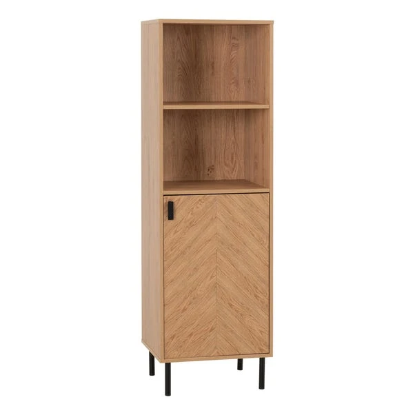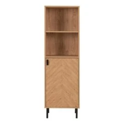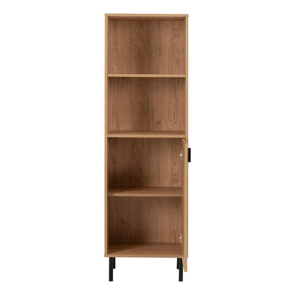 This cabinet boasts an ingenious design that maximises space efficiency. Crafted in a medium oak effect with a captivating wood grain finish, this cabinet exudes timeless charm while the sleek black metal hardware adds a contemporary edge. Beyond its single door revealing two spacious shelves, the clever addition of two open shelves above the door provides even more storage versatility.