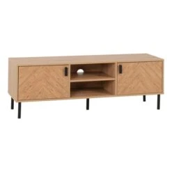This TV stand features a stunning medium oak effect piece with wood grain finish and sleek black metal hardware. This flat pack unit offers both style and practicality, featuring ample storage behind two doors to neatly organise media essentials while adding a touch of contemporary elegance to your living space.