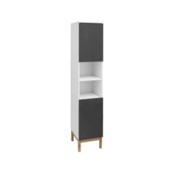 This unit’s two push-to-open doors and two open shelves offer generous storage options. Crafted with easy-to-clean surfaces and boasting a sturdy build, this tall unit embodies both functionality and a contemporary aesthetic. The adjustable door hinges further enhance its versatility, allowing you to customise it according to your preferences.
