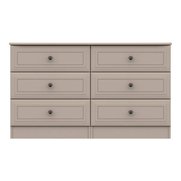 The Portia 6 Drawer Wide Chest offers a stunning timeless design, perfect for enhancing any bedroom space. This stylish chest of drawers offers a traditional styling, with its elegant bevelled edge profile drawer fronts with beautiful crystal look handles. Supplied fully assembled for convenience, the Portia comes with six spacious drawers, complete with 8mm heavy duty bases, linen look insides and easy glide metal runners.