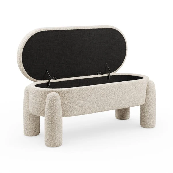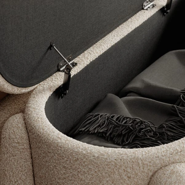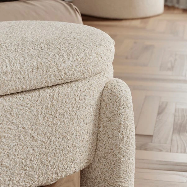 Add a cosy and functional accent to your living space with the Romy Boucle Storage Ottoman, finished in a natural colourway. This stylish ottoman combines a sleek, modern design with practical storage, making it a versatile piece for any room.