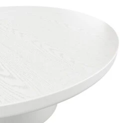 The Rumi Coffee Table features a contemporary design with a white wood grain-effect and conical shaping. Its curved edging adds a touch of elegance, making it suitable for multi-room use. This versatile piece blends seamlessly into any modern living space.