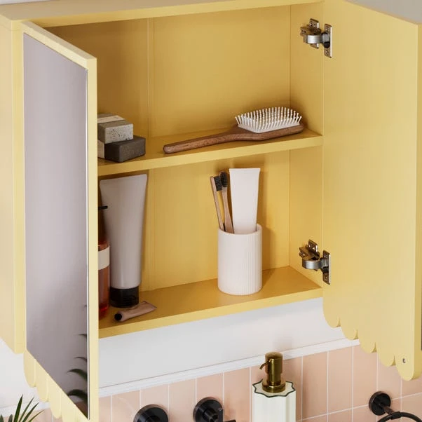 Sporting a charming scalloped design, this cabinet is perfect for adding a chic finishing touch to your bathroom. A brilliant space saving solution, this cabinet features two mirrored doors and an internal shelf, performing multiple functions at once. Available in a range of stylish colours, you can neatly store your bathroom essentials with ease.