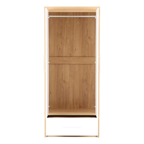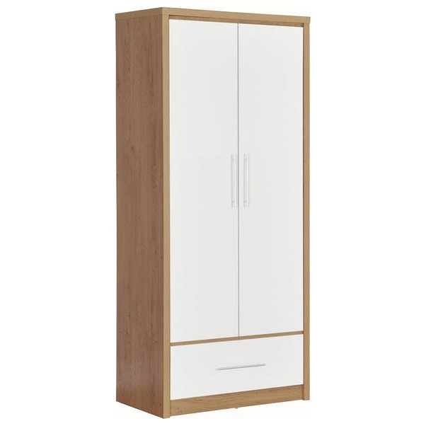 The bright Seville Double, 1 Drawer Wardrobe features a modern design owing to the gloss finished front which contrasts perfectly with the light oak veneers. The Seville has your storage needs covered thanks to the top shelf and hanging space from the metal rail.