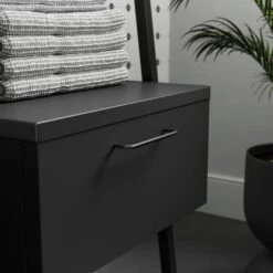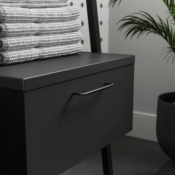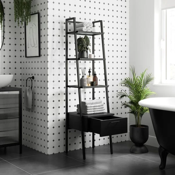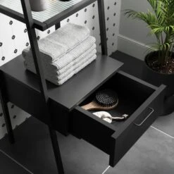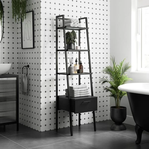 This versatile shelving unit seamlessly marries contemporary design with practicality, making it a standout addition to any living space. The sturdy frame, finished in a timeless matte black, exudes sophistication and complements the reeded glass shelves that offer a delicate touch to the overall structure. The large drawer allows you to store away your less aesthetic clutter. The ladder design not only provides an open and airy feel but also maximises vertical storage, making it perfect for displaying your cherished books, art pieces, or decorative items.