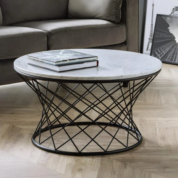 Boasting a stunning marble design, this coffee table is perfect for displaying all your magazines, flowers or coasters. With a unique design, each top is slightly different due to marbles unique nature. This table has a distinct black wire base that gives your living room a modern look.