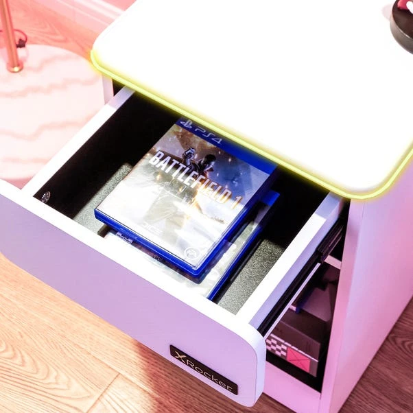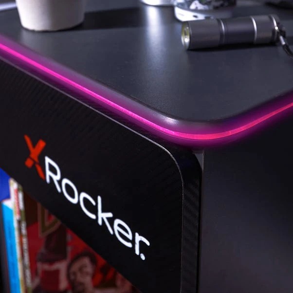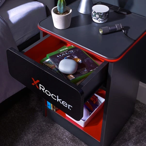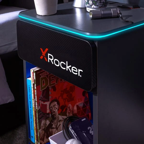 Bring a glow to your bedroom with X Rocker’s innovative Neo Fibre LED lighting technology in this futuristic style bedside table. Built for style and practicality, this side table is designed with a carbon fibre finish to create a smooth surface, enhanced with high tech functionalities and versatile storage, perfect for displaying collectables or night-time reading in the open space and personal bits and bobs in the neat drawer. Equipped with wireless charging technology, you’ll never have to worry about your battery being on low as the built-in charge pad delivers up to 15W of charge power once activated (USB power supply not included, use in conjunction with the manufacturer’s phone charger for best results). To boost the ultra-cool looks in your space, the innovative LED lighting provides a unique and colourful glow to your bedroom set up with multi-colour options to choose from. Powered by a built-in control panel that connects via USB Type-A cable to your power supply (wall adapter or power bank and remote control not included)